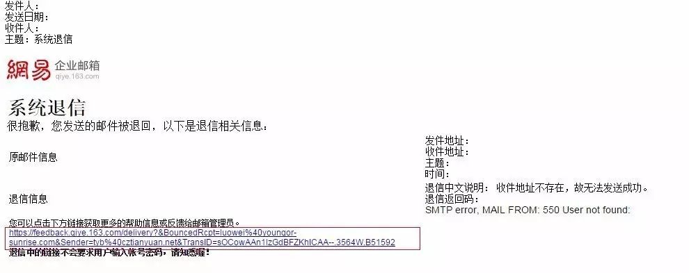 退信后会收到退信邮件提醒(中英文版本),其中包含退信原因。但如果需要看更准确的退信原因,您可以点击退信中的链接(https://feedback.qiye.163.com/xxxxx) 获取退信原因及解决方案;准确定位问题,快速获取处理建议。